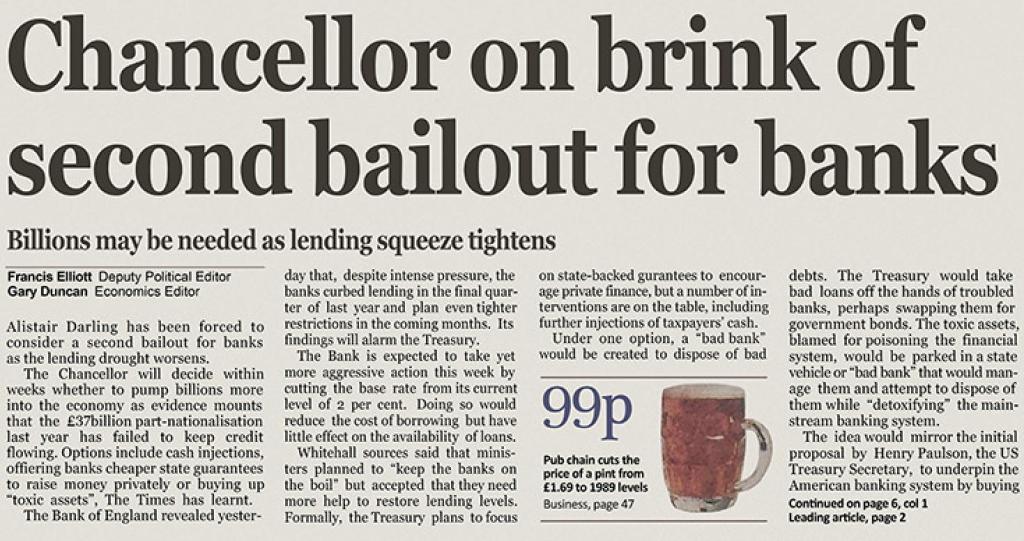 ‘The Times 03/Jan/2009 Chancellor on brink of second bailout for banks.’