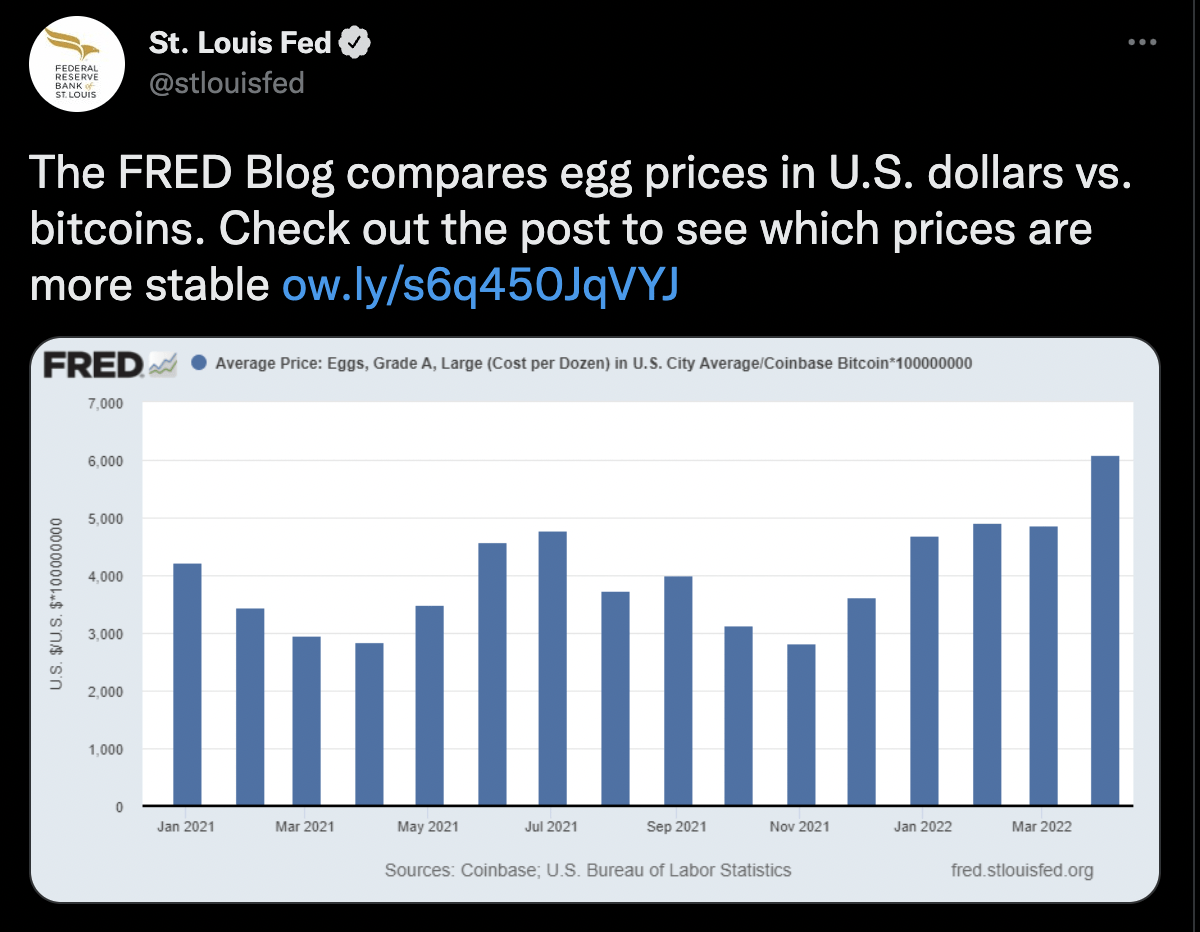 The St. Louis Fed has been cracking up Bitcoiners on Twitter by comparing eggs priced in Bitcoin with the U.S. dollar over on their FRED Blog. We’re not ‘yolking’…