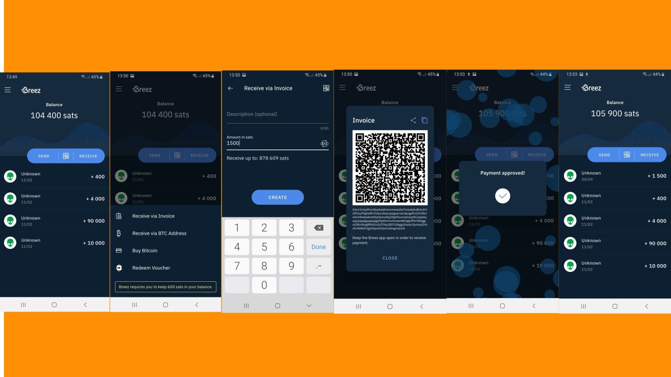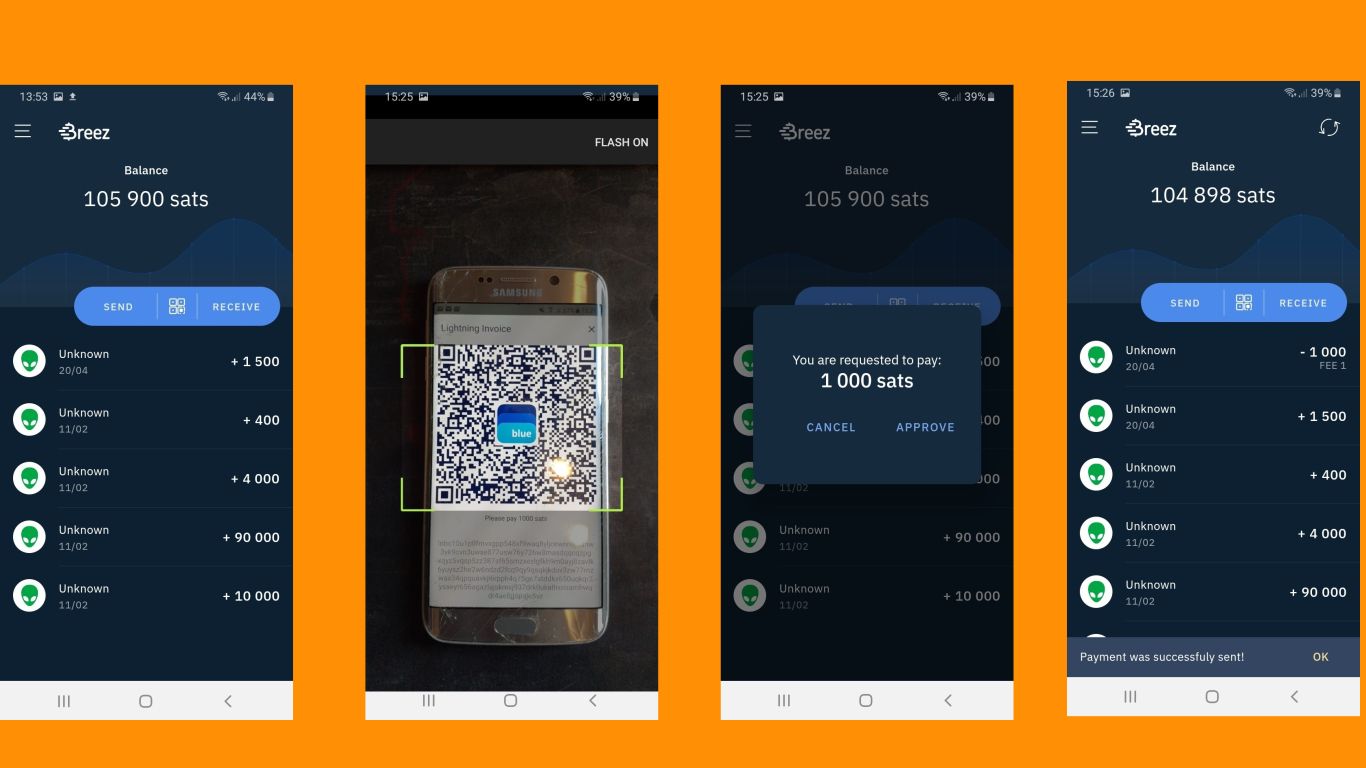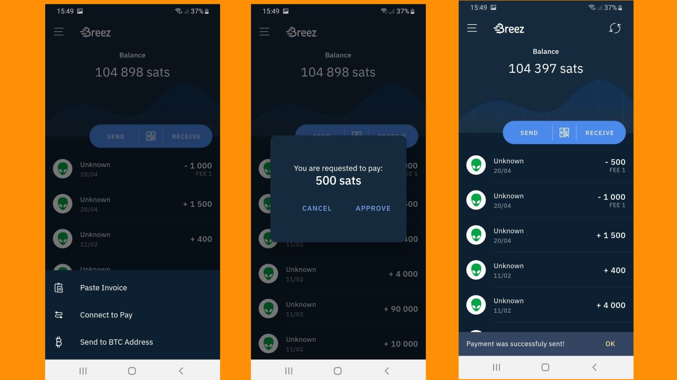 If you want to spend via your Lightning wallet on a mobile website or using a desktop wallet, you will not be able to scan the QR code displayed on your mobile or PC screen. Instead, you will need to copy the invoice presented by the retailer, then click ‘Send’ and then ‘Paste Invoice’. The Breez wallet automatically finds the invoice you have copied (eg 500 sats) and you just need to hit ‘Approve’ to pay it. Your wallet will then display the ‘Payment was successfully sent!’ notice, and your balance will be updated.