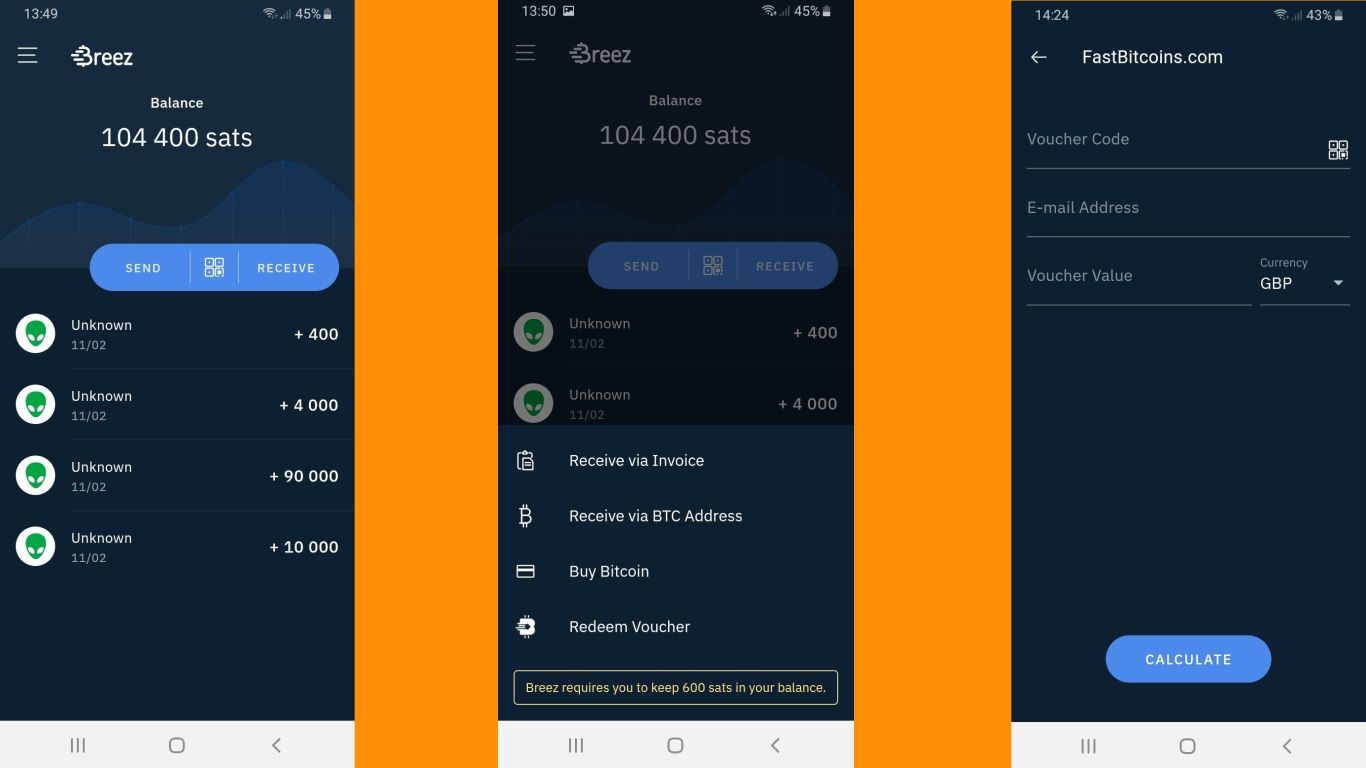 If you have no Bitcoin (and no friends to get it from), fear not. Head over to our website to find a FastBitcoins merchant you can buy it from. FastBitcoins lets verified users buy physical bitcoin vouchers in physical shops using cash. These vouchers can be redeemed within partner Lightning Wallets (like Breez) in seconds. When you’ve got your hands on a voucher, click ‘Receive’ and select ‘Redeem Voucher’. Enter the voucher code, email address and voucher value, and select ‘Calculate’. If you are happy with the exchange rate select ‘Redeem’. Your bitcoin will be delivered to your Lightning Wallet in minutes. You can of course redeem FastBitcoins vouchers even on non-partner wallets.