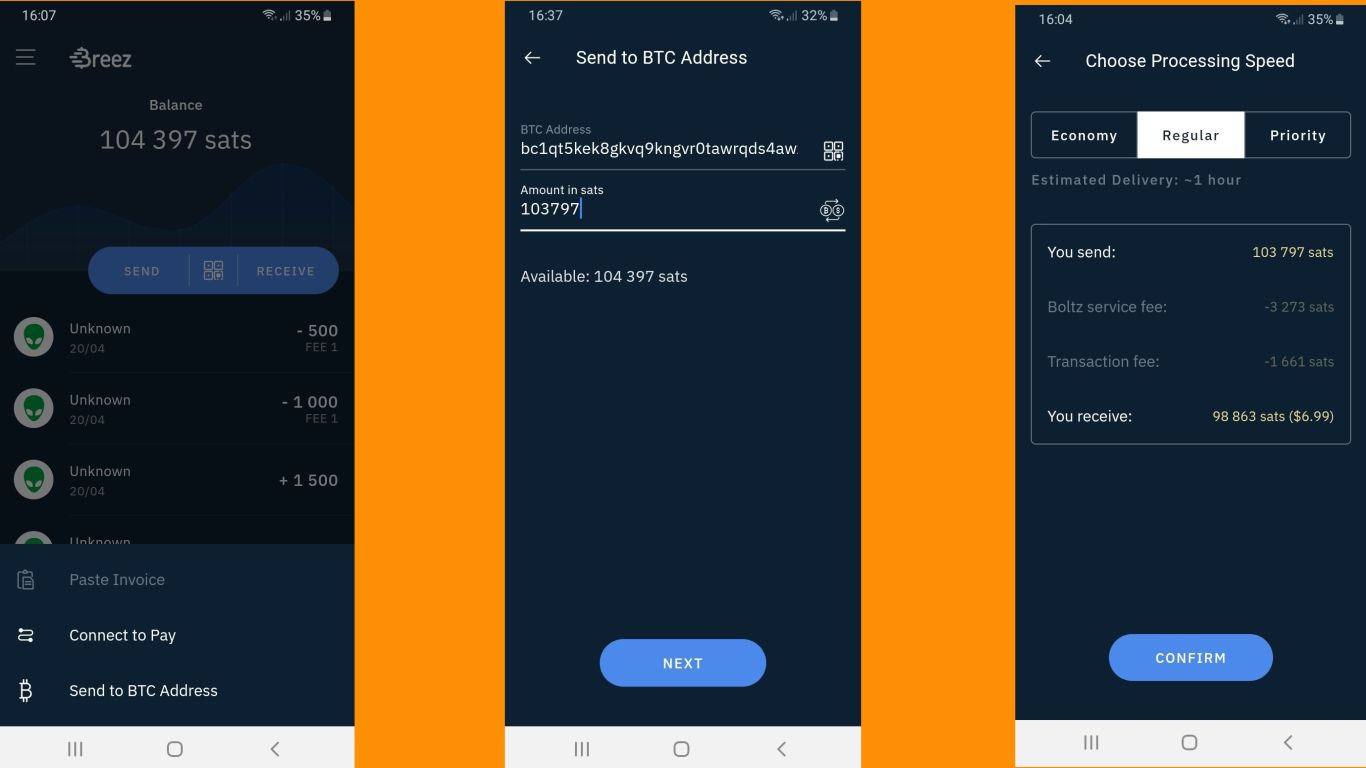 Step 4 - How to withdraw from your Lightning Wallet to your Bitcoin Wallet: to remove bitcoin from your Lightning Wallet into your Bitcoin Wallet click ‘Send’ then ‘Send to BTC Address’. Here you will be prompted to enter your Bitcoin Address and the amount of Satoshi's to withdraw. Then, click ‘Next’ and select the processing speed for the transaction. Then hit ‘Confirm’ to send the transaction.