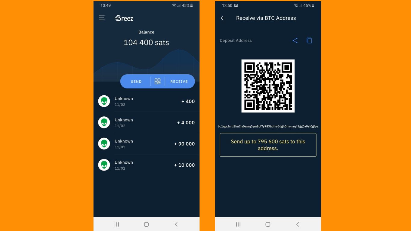 Step 2 - Funding your wallet: now you have a wallet it’s time to fund it with bitcoin! If you have Bitcoin stored on another wallet, you can send some from this to your Lightning Wallet. To do this in Breez, click ‘Receive’ and select ‘Receive via BTC Address’. Use your Bitcoin Wallet to send your desired amount of bitcoin to your new Lightning Wallet at the address displayed.